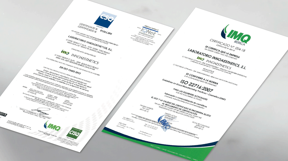 INNOAESTHETICS kozmetik ürünleri üretmek için ISO 22716: 2007 sertifikasını ve tıbbi cihazları tasarlamak, üretmek ve ticarileştirmek için ISO 13485 belgesini alır. -