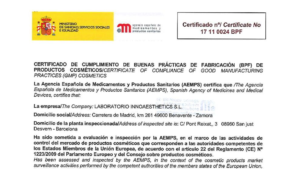 INNOAESTHETICS, İspanya Sağlık Bakanlığı tarafından verilen kozmetikler için iyi uygulamaların uygunluk sertifikası verildi -